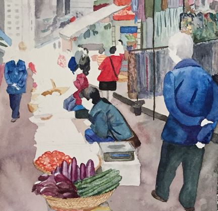I’ve been painting a street market we visited in Xian, China, last year. I enjoy visiting markets at home and when I travel, and I have lots of market photos that I’d like to paint. The Xian market is the most complicated painting I’ve ever done–lots of details, a long depth to represent, and people (!)–the first time I’ve ever painted figures. I’m almost finished. Here are photos I’ve taken of my progress each week.