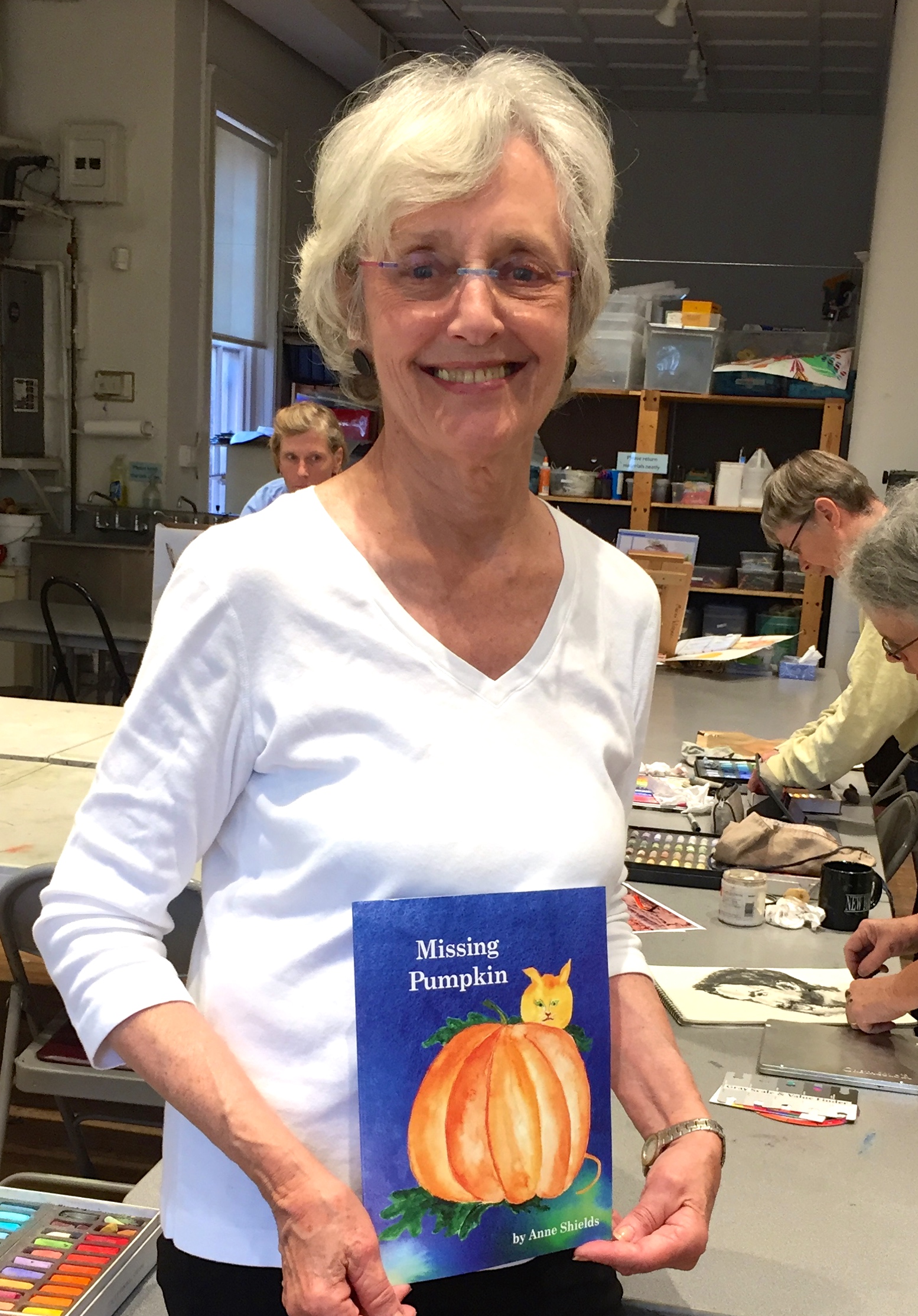 Creativity in the Wednesday Studio is not limited to graphic art. Anne Shields has written and illustrated (in watercolor!) a children’s book titled Missing Pumpkin.