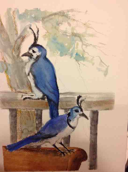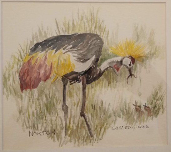 Anne Shields: Canyon Wren. Pastel.Linda Norton: Crested Crane, Tanzania. Watercolor.Marian Wiseman: Chickadee-dee-dee-dee. Watercolor.Kay Elsasser: White-Throated Magpie-Jays. Watercolor.Tom Eichenberger: Butch the Cormorant. Wood, circuit board, black onyx.