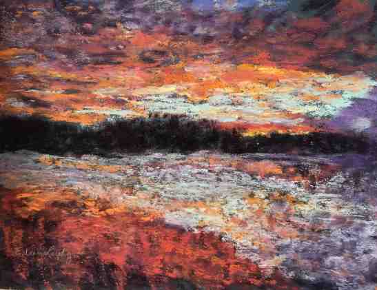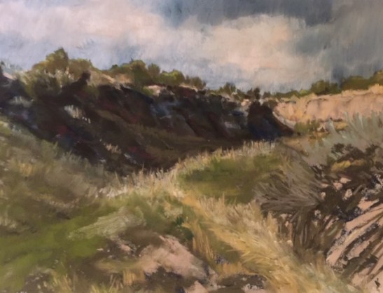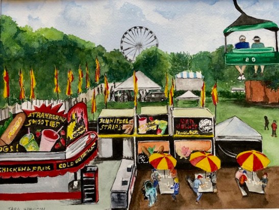 Tara Hamilton: State Fair. Watercolor.Eileen Leahy: Sunset. Pastel.Wan Lee: Palm Parade. Watercolor.Linda Andreatta: Biblioteca, Florence. Pastel.VInce Iannacchione: Bob on Holiday (v2). Mixed media.Carolyn Rondthaler: Hiroshima, August 6. Mixed media.Martha Pope: Montana Creek Bed. Pastel.Marian Wiseman: Housing the Third Branch. Watercolor.