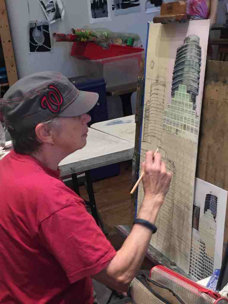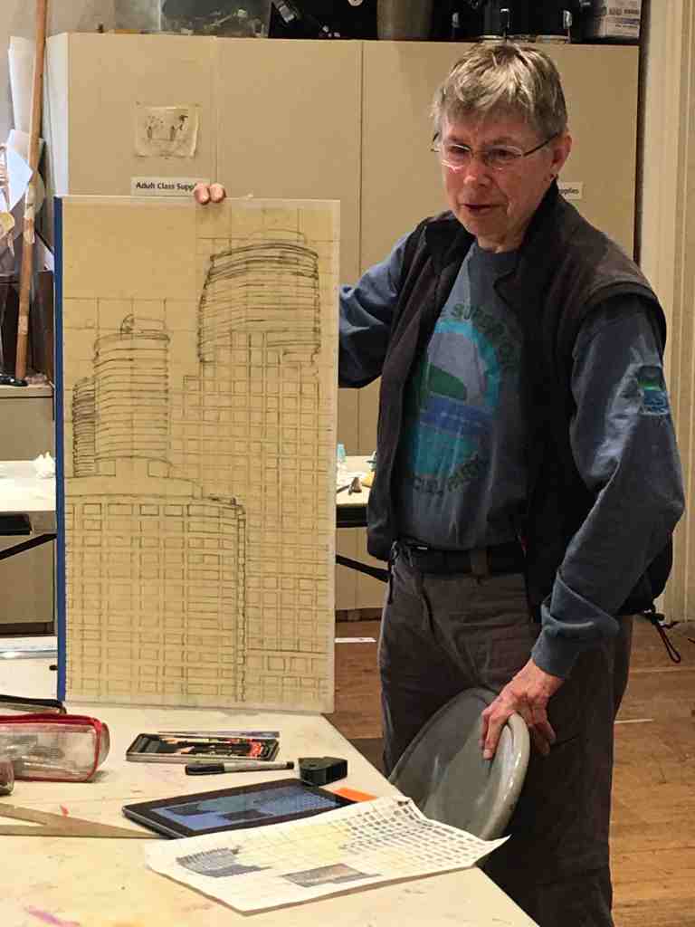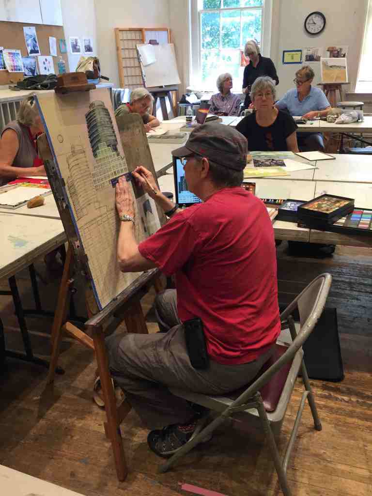 This pastel represents monumental effort, in my opinion. Fran worked on it in the Wednesday Studio for a very long time, so we all got to see it come together. I took a few pictures along the way, and here are some shots of Fran and the work in progress: