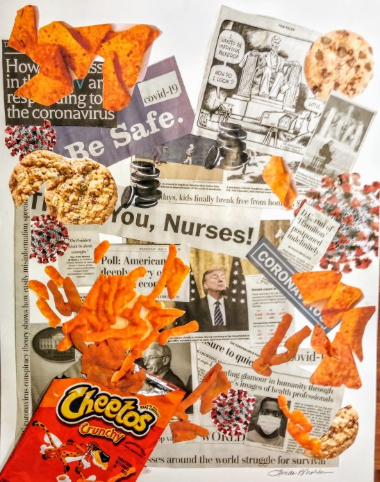 Linda Norton: Quarantine is Crumby. Photo collage.Carolyn Rondthaler: In a Mood. Mixed media.