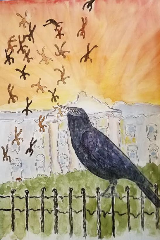 Nancy Arbuthnot: White House Meltdown. Watercolor and ink. Artist statement: ” My ink and watercolor piece, “White House Meltdown,” is inspired by the convergence of the ongoing novel coronavirus pandemic and the demonstrations against the recent deaths of African Americans by law enforcement officers. It also grows from a collage technique I developed during the early spring days of the pandemic when, taking the opportunity while sheltering in place to observe the myriad birds migrating through my neighborhood, I began to create realistic ink and watercolor depictions of individual birds which I then glued onto more abstract backgrounds. As my project with birds expanded over the weeks, I began to move towards symbolism as well as abstraction. This piece, a somewhat cartoonish portrait of a melting White House, is my most symbolic (or at least most suggestive) work to date, with references to James Baldwin’s The Fire Next Time, L. Frank Baum’s The Wonderful Wizard of Oz, the Beatles’ “Blackbird,” the murder of African Americans, and the retreat of Trump to the White House bunker. In all my art I seek to cross borders, fusing genres, media, form and function, thought and feeling, the individual and the community. While looking back to the past by echoing themes, forms, images and techniques of artists, I also want to speak deeply to a contemporary audience, in contemporary language and forms. Recently I have discovered that the expanded form of a series of works rather than individual artworks enables me to highlight isolated moments while also conveying broader experiences. (A major project in 2018, “Postcards from the Border,” was a series of 4×6-inch watercolor sketches combined with short poems exploring issues on the Arizona/Mexico border). Works in series also offer greater opportunities for the viewer to engage with my art, a participation that is integral to my work and in fact impacts how I create. I am not certain where “White House Meltdown” will lead me in terms of a new series—but maybe that direction will be inspired by audience response!”