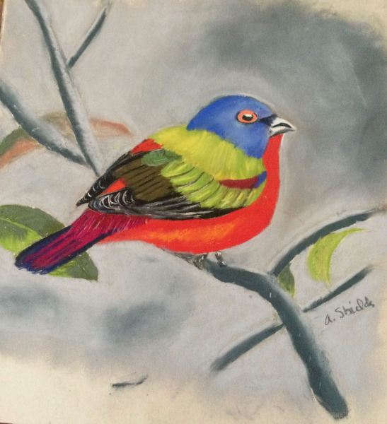 Below is the photo that ran in the newspaper, and then you will see two artistic renderings of the bird by Wednesday Studio members. Another Wednesday Studio artist plans to paint the painted bunting (say that fast 40 times!) for next time.