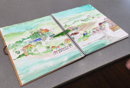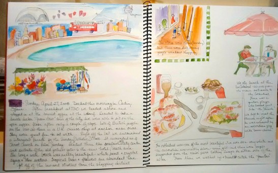 Both at home and when she traveled, Linda kept a sketchbook. In a post she wrote about it in this blog, she said, “I can sketch while I wait for my food in a café, sit on a park bench, or wait for a train. I strive to record what captures my eye or strikes my fancy. . . . There is so much to be gained from simply observing a scene or a thing. When I have recorded something on paper, I have actually taken the time to LOOK at it . . . to soak it in. After the trip, my sketch will take me back to that moment much more than any photograph could. Passersby often stop to watch, or to chat. It’s a wonderful way to meet people.”