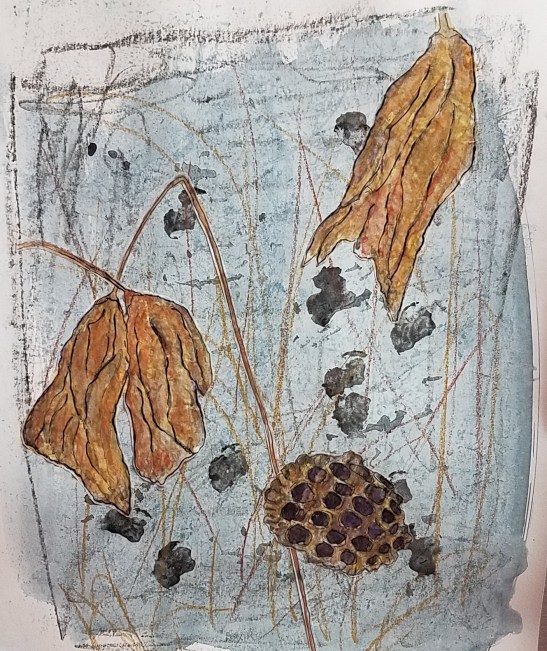 Karen had submitted two works to the “Winter” challenge, and it is this first one, Winter in a Cigar Box, that won. Her other submission and the submissions from other Wednesday Studio members are also below.
