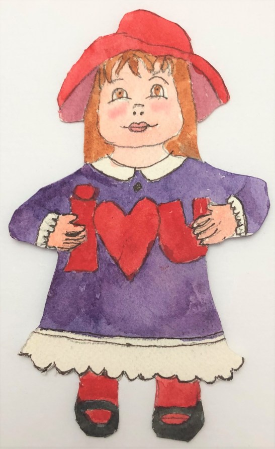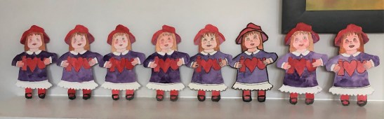 This first photo shows eight individual paper dolls that Carolyn Rondthaler painted front and back. (She propped them up on the mantel for this pic.) You don’t have to look too closely to see the distinctions–mostly in the faces. Carolyn says she used to make such dolls as valentine cards for some special people, but hadn’t done it for several years and just got back to it this year.