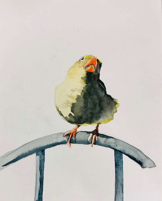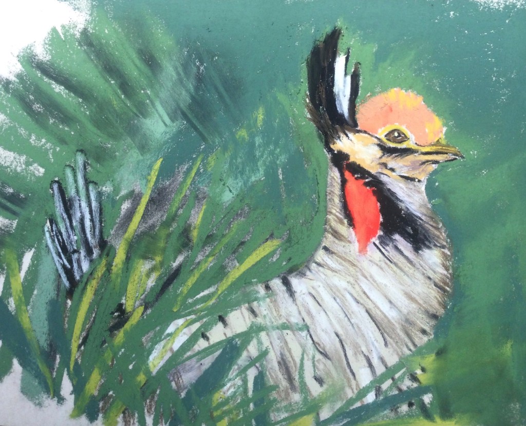Tara Hamilton: I Am Not a Chicken. Watercolor. [This is a sparrow Tara saw outside a coffee shop, but the sparrow looked like a chicken.]Anne Shields: Male Lesser Prairie Chicken. Pastel. [This bird IS a chicken. He is doing his spring mating ritual of prancing and jumping and dancing at sunrise, while “booming,” which is calling out his distinctive mating sound. Click here for a video with sound.]Carolyn Rondthaler: Red-Headed Woodpecker. Watercolor.Karen Van Allen: Heron. Graphite, pastel, and charcoal on paper.Nancy Arbuthnot: Phoebe among Purple Fringed Orchids along Park Central Road in Catoctin Mountain Park, Thurmont, Maryland. Watercolor. [Nancy was artist in residence in May at the Catoctin Forest Alliance Artist in Residence Program. This was part of her “Catoctin alphabet project”–she was up to the P’s.]Tom Eichenberger: Bluejay. Acrylic.Andrew Armstrong. Green Crane (from my imagination). Watercolor.Marian Wiseman: Sandhill Crane (in the yard at Inverness, Florida). Colored pencil.