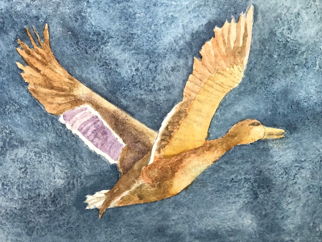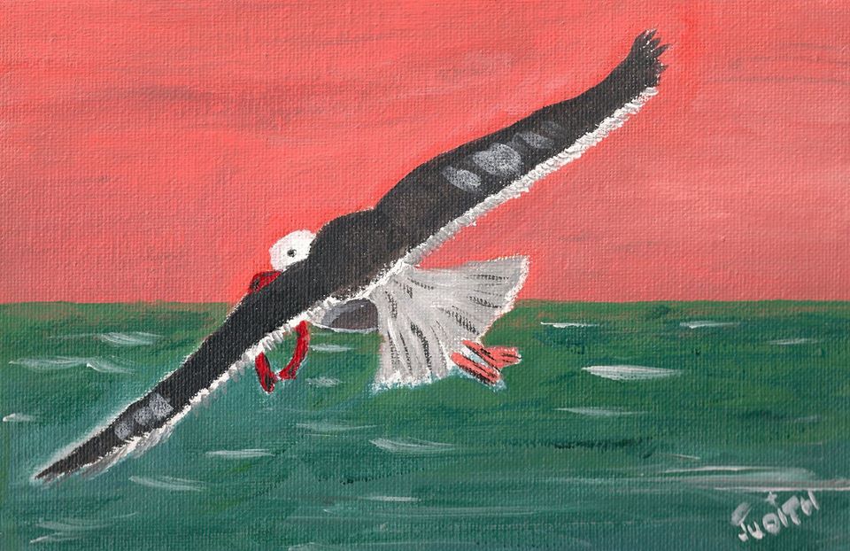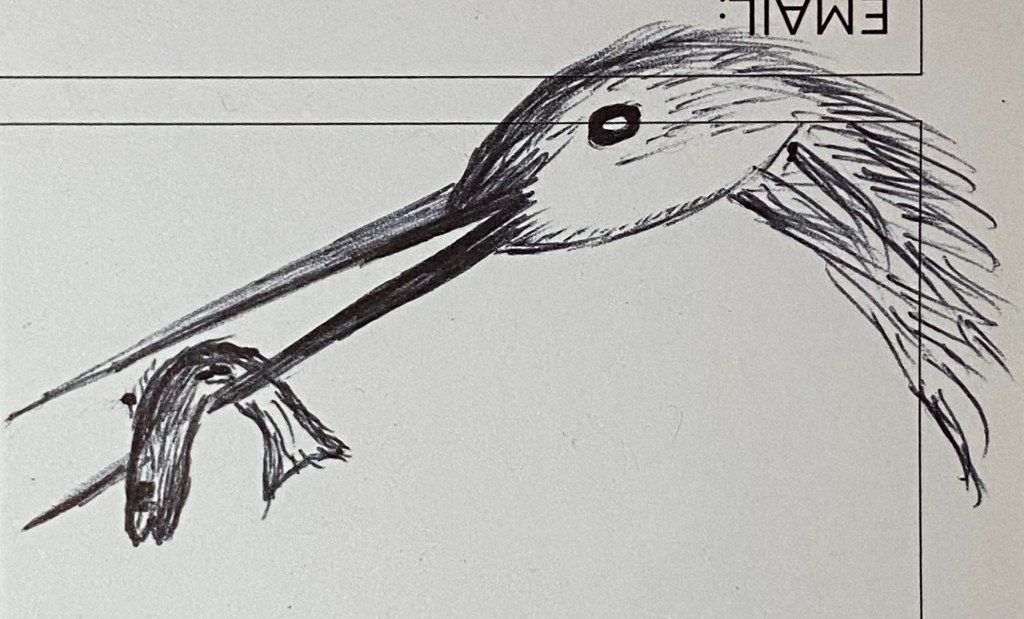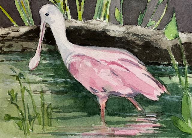Tara Hamilton: Roseate Spoonbill. Watercolor.Tom Eichenberger: Sardinian Warbler. Ink and colored pencil.Pat Stocks: Peacock. Pastel.Karen Van Allen: August Bird. Acrylic on canvas.Anne Shields: Great Egret. Pastel.Carolyn Rondthaler: Female Mallard. Watercolor. [From a photo by Prashant Gaspure.] Hazel Stump, age 11. Bald Eagle. Lillian Stump, age 8. Bird Life.Judith Davis: Great Black-Backed Gull with Spider Crab. Acrylic on board.Andrew A: Killing Time. Pen on glossy card stock. [done during a meeting–Andrew notes that you can do art any time, any where.]. Marian Wiseman: Marbled Godwit. Watercolor. [Seen in Mexico.]