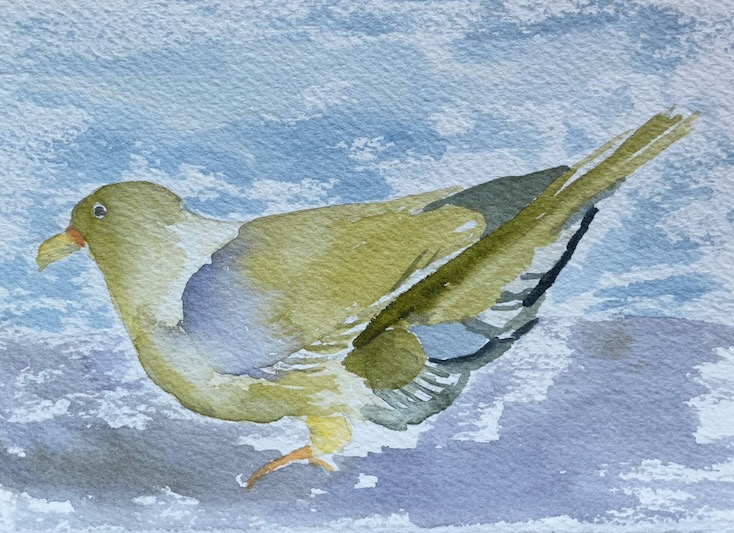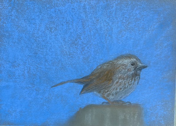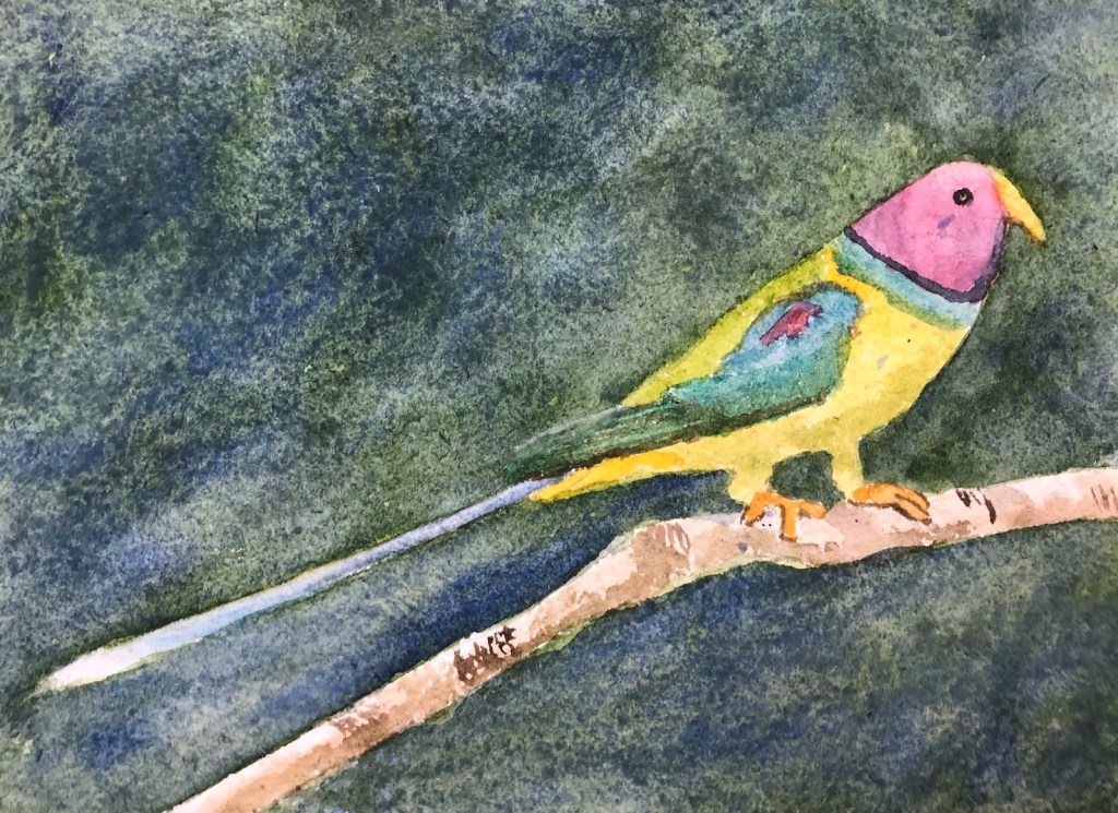 Tom Eichenberger: Bluebird. Pen and colored pencil.Tara Hamilton: Bird with Blue Feetand Beak. Watercolor. Pat Stocks: Song Sparrow. Pastel.Carolyn G, age 5, and Lillian S, age 8: Colored Birds.Carolyn Rondthaler: Plum-Headed Parakeet. Watercolor.Marian Wiseman: Green Pigeon [South Africa]. Watercolor.