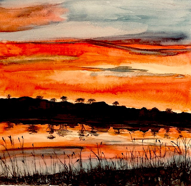 Tara Hamilton: Summer in Elm Grove Park, Wisconsin. Watercolor.Carolyn Rondthaler: Hiroshima August 6, 1945. Watercolor. Carolyn said, “This is a painting inspired by a map of the effects of the atomic bomb on the city of Hiroshima. The brown areas are rivers and the broken line at the top is a railroad. The dot is the epicenter.”