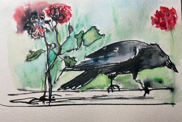 Tamora Ilasat: Crow in Flower Box. Watercolor.