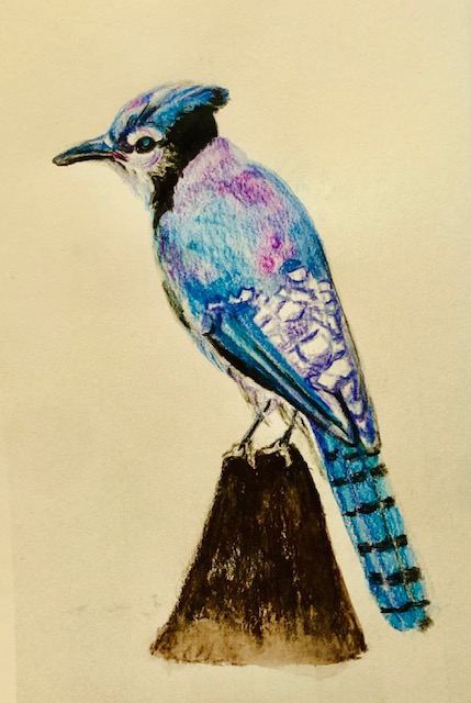 Tara Hamilton: Blue Jay. Watercolor pencil.