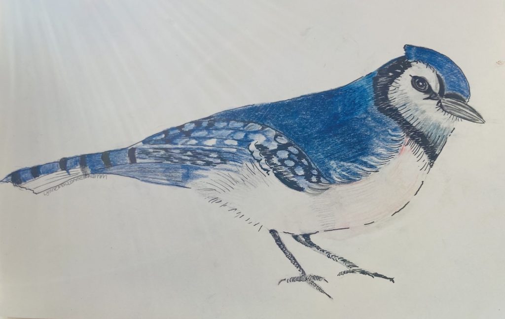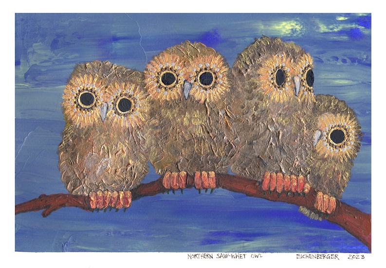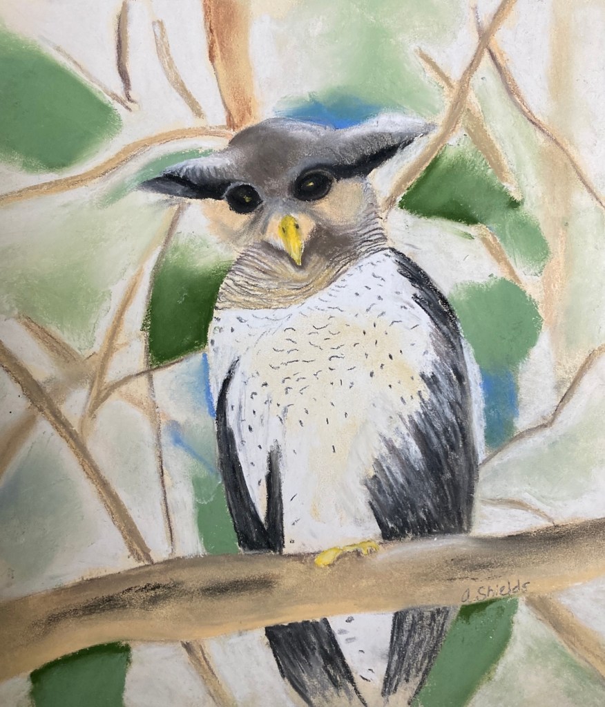 Eileen Leahy: Green Heron. Colored pencil on toned paper.Fran Tomlinson: Buller’s Albatross. Colored pencil. [Also called Buller’s Mollymawk, this is a small mollymawk in the albatross family. It breeds on the islands off New Zealand and is named for the New Zealand ornithologist Walter Buller.]Carolyn Rondthaler: Great Blue Heron II. Watercolor. Tom Eichenberger: Northern Saw-Whet Owlets. Acrylic on paper. [Adult northern saw-whet owls are about the size of an American robin and are one of the smallest species of owls in North America.]Jim Eichenberger: American Avocet. Watercolor, tempera, pencil, and pen, on Bristol heavyweight paper. [This is a North American shorebird, about 16-20″ long.]Tara Hamilton: Hummingbird. Watercolor. Lynne Mallonee Schlimm: Blue Jay. Colored pencil and ink.Susan Burdick: Fretful Flamingo. Graphite.Anne Shields: Barred Eagle-Owl. Pastel. [Native from the Thai-Malay Peninsula to Sumatra, Java, and Borneo.Judith Davis: Yellow-Shafted Northern Flicker. Acrylic. [State bird of Alabama.]Marian Wiseman: Brown Thrasher. Watercolor. [State bird of Georgia.]