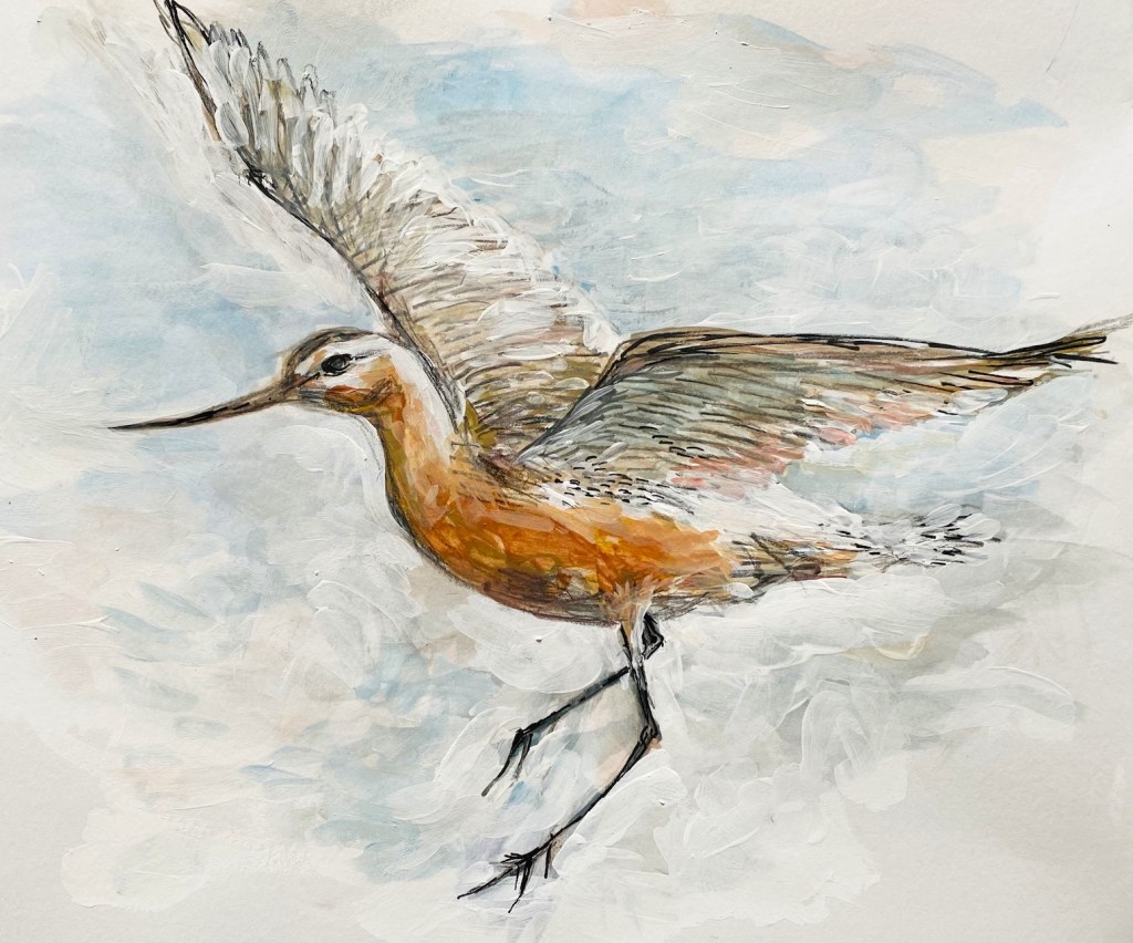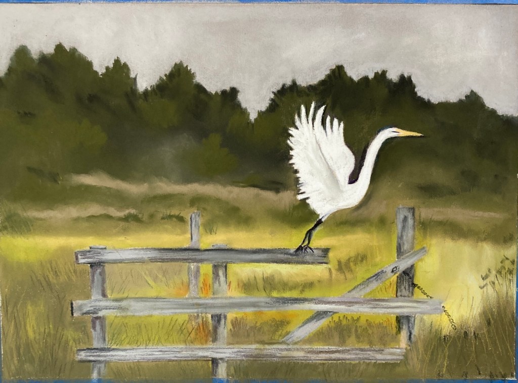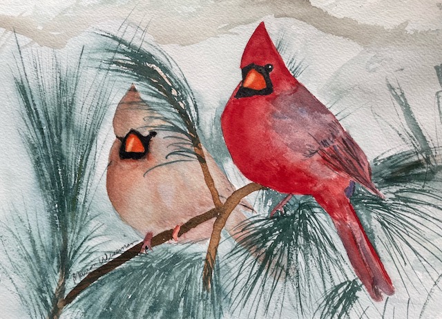 Vince Iannacchione: Puffling. Charcoal and colored pencil.Anne Shields: Preparing for Takeoff. Pastel.Tara Hamilton: Scintillant Hummingbird. Watercolor.Carolyn Rondthaler: Summer Tanager. Watercolor. [From photography by Kathy Doremus, Backyard Bird Nerd.]Judith Davis: King Eider on Cape Cod. Watercolor. [Judith says this bird is rare at Cape Cod.]Susan Eichenberger Hazelwood: Green Heron. Watercolor pencil and graphite.Jim Eichenbeger: Bar-Tailed Godwit. Pencil, pen, watercolor, and tempera. [Jim says that this bird, which is in the sandpiper family, can fly 6,000 miles in a week to migrate from Alaska to Southern Asia.]Tom Eichenberger: Limpkin. Acrylic.Marian Wiseman: Cardinals. Watercolor. [State bird of seven contiguous states: Illinois, Indiana, Ohio, Kentucky, West Virginia, Virginia, and North Carolina.]