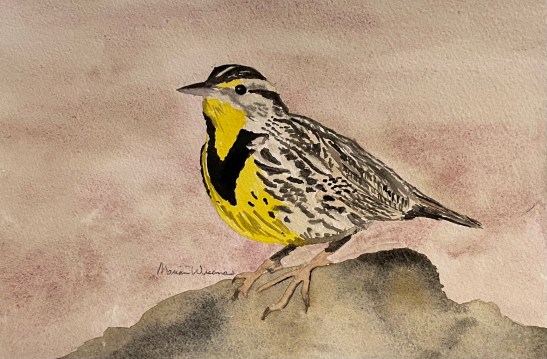 Anne Shields: Northern Mockingbird. Pastel.Carolyn Rondthaler: Blue Heron. Watercolor. From a photograph by Laura Hunsinger-Kelly.Donna Breslin: Cardinal in the Snow. Pastel.Judith Davis: Dark-eyed Junco in Snow. Photography.Susan Burdick: Pine Warbler. Felt-tip pen and digital water color (Fresco).Jim Eichenberger: Western Sandpiper. Pencil.Tara Hamilton: Mr. Toucan. Watercolor.Marian Wiseman: Western Meadowlark. Watercolor. (State bird of Kansas, Montana, Nebraska, North Dakota, Oregon, and Wyoming.)