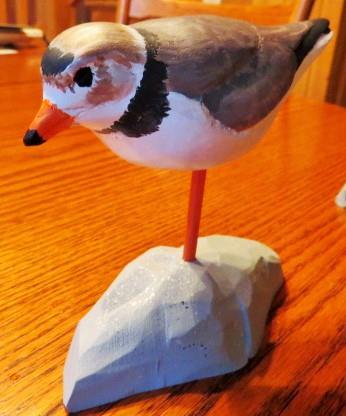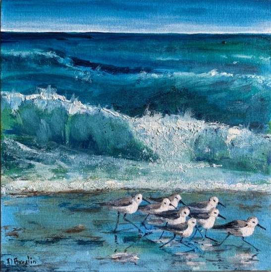 Judith Davis: Piping Plover. Painted wood carving. Judith writes, “Piping plovers, small and delicate, are my favorite small shorebirds, and they nested on Cape Cod where I saw the chicks every year.”Judith Davis: Piping Plover on Cape Cod. Photography. Tara Hamilton: Piping Plover. Watercolor.Susan Burdick: Killdeer. Digital colored pencil and watercolor (Adobe Fresco). Susan says, “I remember the call of the killdeer with great fondness from the time we lived in the country.”Tom Eichenberger: Pelican. Acrilyc.Donna Breslin: Surf’s Up. Sandpipers. Acrylic on canvas board.Pat Stocks: Swan. Pastel.Jim Eichenberger: Painted Stork. Watercolor, tempura, and pencil. [The painted stork is found in tropical Asia. Jim painted this from one of the photographs I sent him of painted storks I saw in Sri Lanka. MW]Carolyn Rondthaler. Black-Necked Stilt. Watercolor.Marian Wiseman: American Oystercatcher. Watercolor.