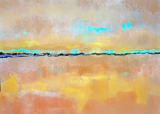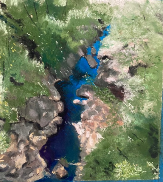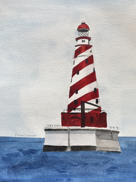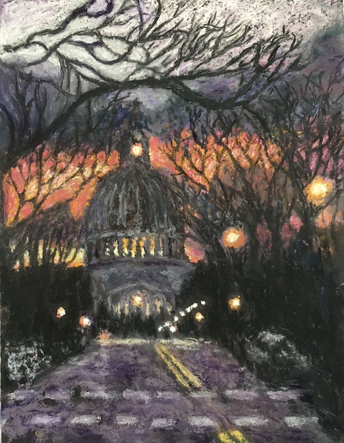 Eileen Leahy: Sunset. Pastel.Ann Billingsley: Across the Pond. Block print.Anne Shields: View from the Bridge (Glen Echo). Pastel.Martha Pope: Untitled. Digital Procreate painting.Linda Andreatta: Zhangye National Geopark. Chalk pastel.Fran Tomlinson: Village Elder. No. 2 graphite pencil.Vince Iannacchione: Death Valley #7. Polymer clay, watercolor, gouache, acrylic, and latex paint.Tara Hamilton: Roadside Stand. Watercolor.Carolyn Rondthaler: Miguel. Water-soluble graphite.Marian Wiseman: White Shoal Light (Lake Michigan). Watercolor.Kirsten Nelson casting her critical judge’s eye on art in the Student Show.
