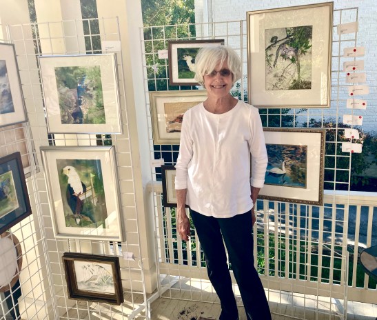Anne Shields in front of some of her art. Note the labels to the right of Anne. The red dot means those pieces were sold—and those were just some of the labels she saved.