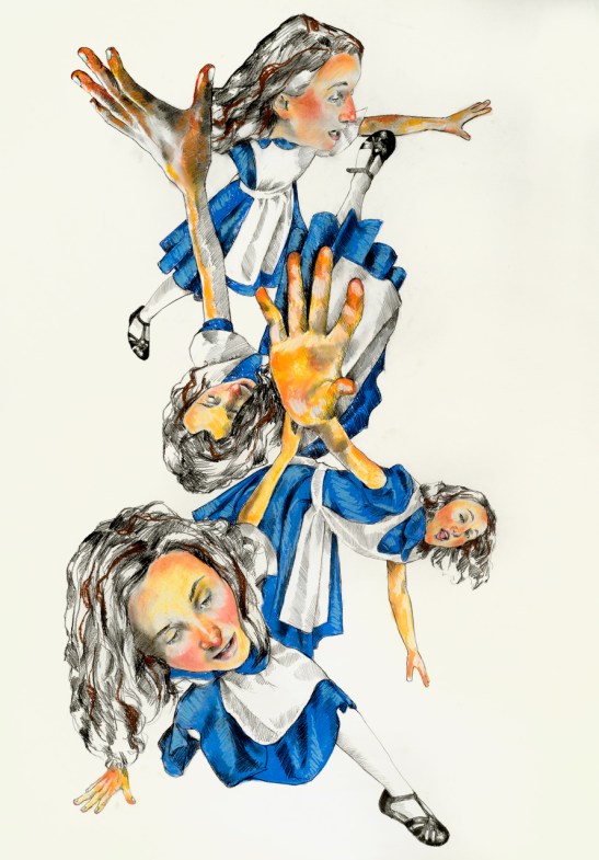 Lewis Carroll’s Alice’s Adventures in Wonderland and Through the Looking Glass are nonsense literature, Ellen points out in her artist’s statement about the show. She says she started out thinking of this project in the order in which characters and scenes appear in the books, but she ended up going down a rabbit hole herself, creating pieces out of order as the inspiration took her.