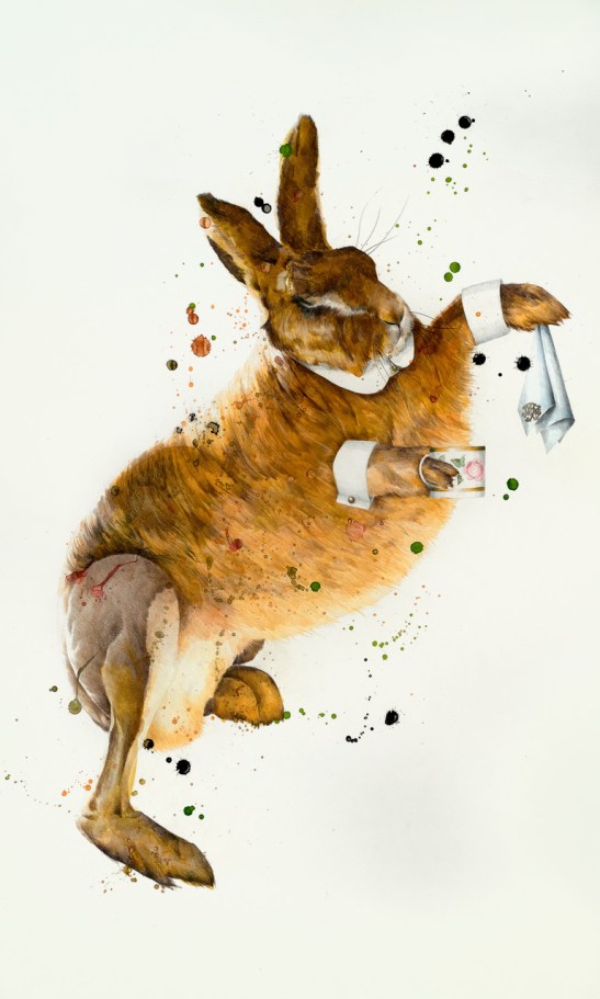 The exquisite drawings range from a darling six-inch hedgehog and a few foot-high rabbits hopping along the baseboard to a number of five-foot characters, such as the Mad Hatter. I might say “life-size,” but who’s to say how tall the Mad Hatter really is in whatever life he had? (And I will confess here that the hedgehog and Mad Hatter are two of my favorites in the show—right up there with the old sheep knitting a sweater or whatever it is she is knitting.)