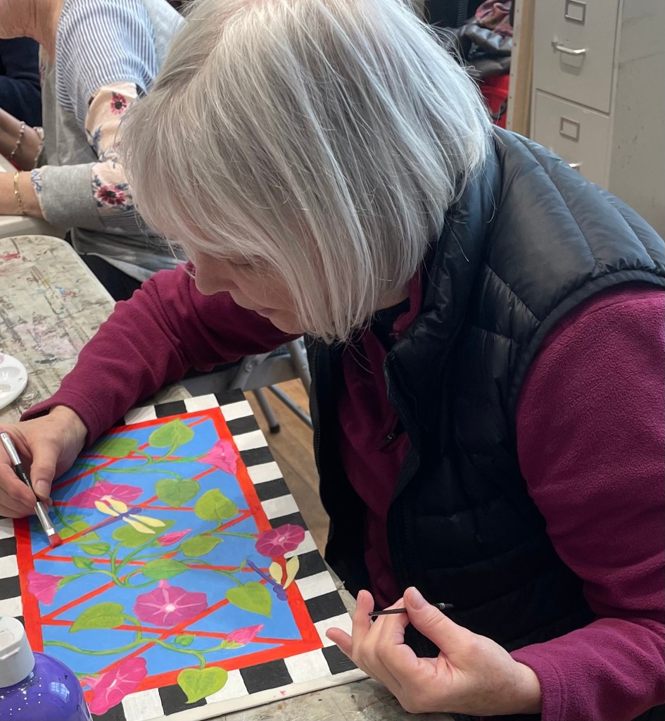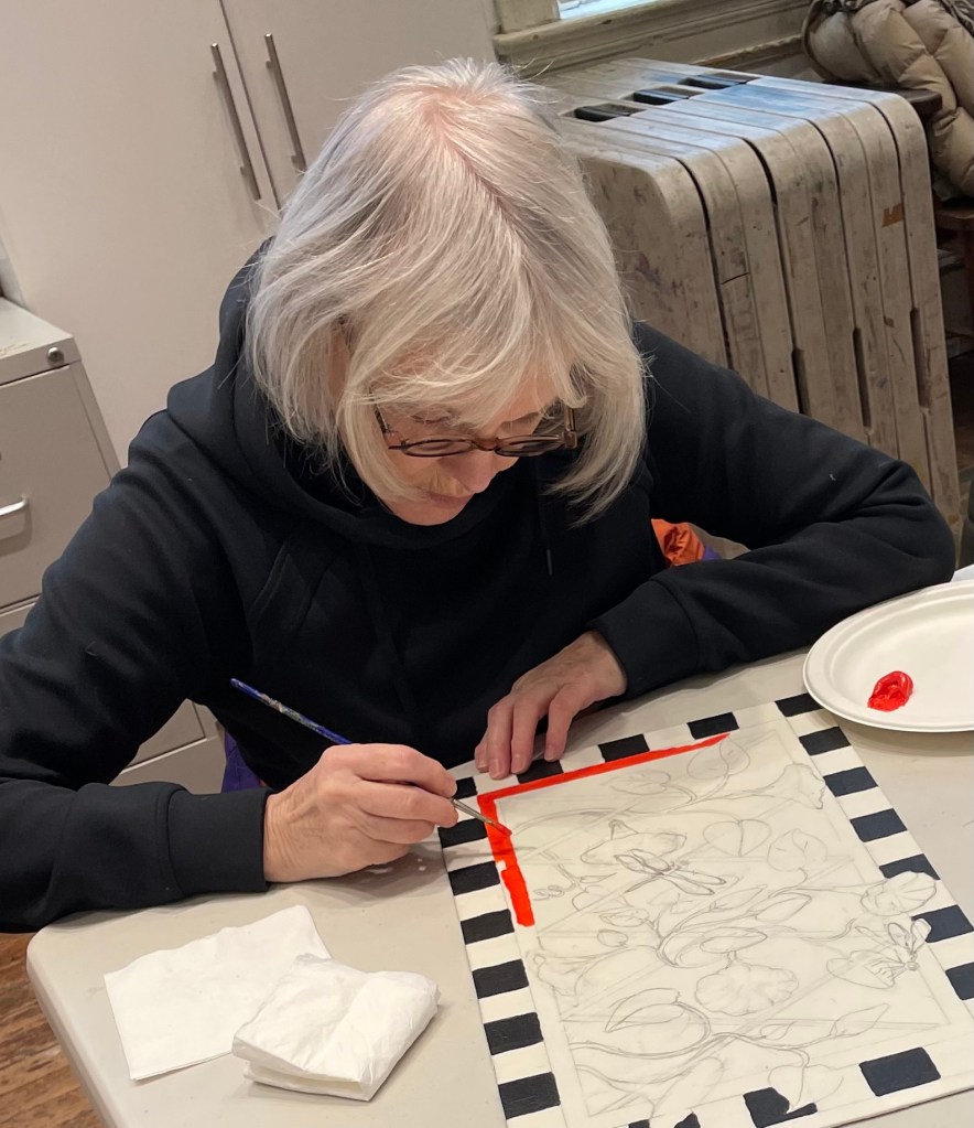 Kay Elsassser (above) made up her own drawing of a bird with leaves and blossoms. Kay usually works in watercolor and said “I never tried this. Acrylic is new to me, and drawing is always fun.”