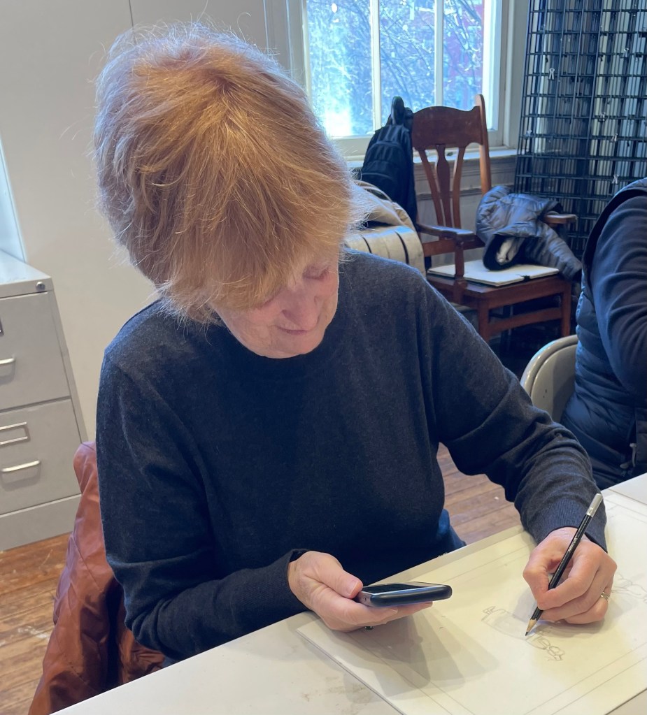 Martha Pope (above) made her own drawing after seeing a design in one of the books Anne brought. Martha noted that she finds the work relaxing.