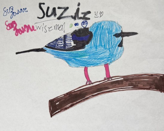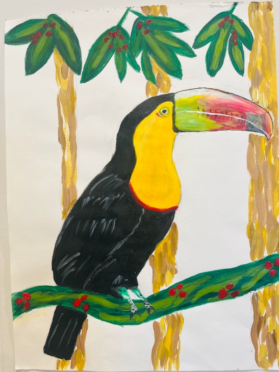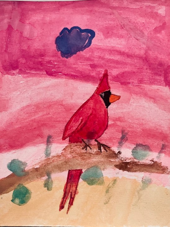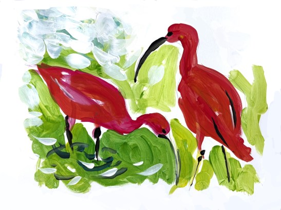 Tara Hamilton: Fiji Parrotfinch. Watercolor.Tom Eichenberger: Mallard. Hairbrush handle, styrofoam, fabric, plaster, and acrylic.Anne Wharam Thomas: Scarlet Tanager in Flight. Watercolor.Benjamin W., age 9: Greater Yellowlegs. Colored pencil.Suzanne W., age 7. Blue Bird. Markers.Kay Elsasser: Green Honeycreepeer. Watercolor.Judith Davis: Green Heron. Photography.Anne Shields: Scarlet Tanager. Pastel.Martha Larkin: Toucan. Acrylic.Mara P., age 7, and Christina Lara: Cardinal. Acrylic.Czevn Johnson: Chuck the Chick. Watercolor.Carolyn Rondthaler: Summer Tanager. Watercolor.Jim Eichenberger: Scarlet Ibis 2: Tempera. [Jim reports that the scarlet ibis likes coastal areas of South America, and he also found it to be the title of a short story and a play. But there’s more: He saw a brown ibis walking around a park in Tel Aviv.]Marian Wiseman: Australian King Parrot. Watercolor. [Yes, this bird really is red with bright green wings. I’d never heard of it until I searched for red and green birds.]
