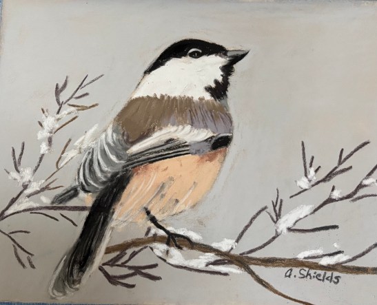 Anne Shields: Black-Capped Chickadee. Pastel. [State bird of Maine and Massachusetts.]