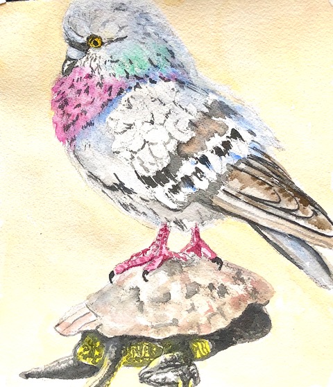 Anne Wharam Thompson. Bufflehead. Watercolor. [Anne reports that this bird winters in our Chesapeake Bay, and she adds that his head feathers were caught in the wind, giving him this unusual “hairstyle.”]