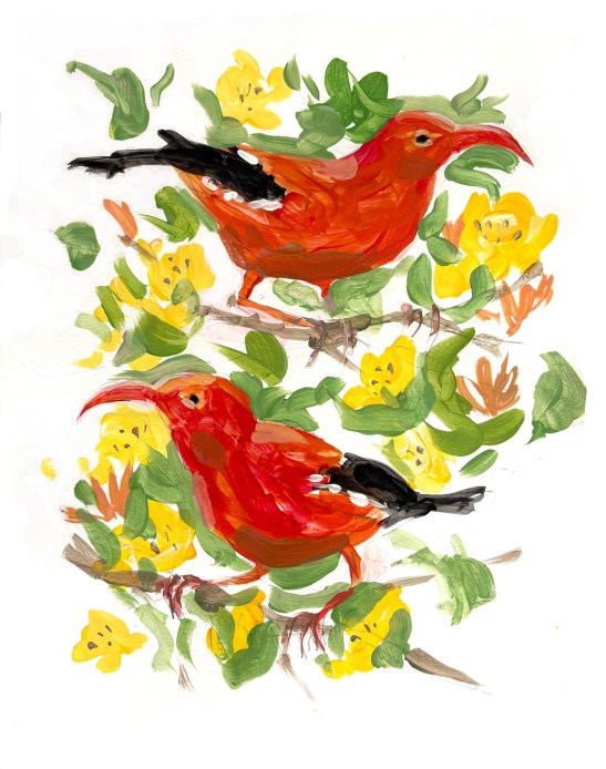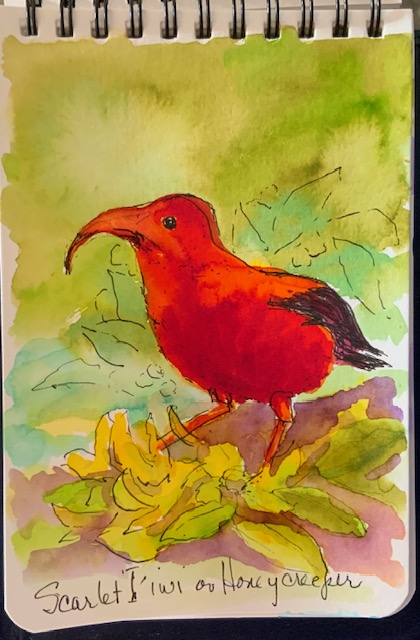 The ‘i‘iwi [pronouced ee-EE-wee] is a native Hawaiian bird that is often mentioned in Hawaiian folklore. It is found only on the Hawaiian Islands. It is a species of honeycreepers. The adult ʻiʻiwi is mostly scarlet, with black wings and tail and a long, curved, salmon-colored bill used primarily for drinking nectar. It’s about 5 1 ½ to 6 inches long.