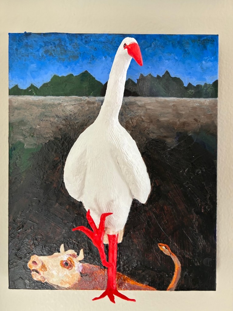 Tom Eichenberger: Western Cattle Egret. Plastic, wood, and acrylic. [There are two images to show that this art is three-dimensional.]